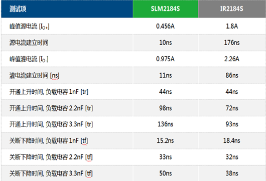 正確理解驅(qū)動電流和驅(qū)動速度詳解測試對比以下通過實測兩款芯片SLM2184S和IR2184S的性能來說明驅(qū)動電流建立時間對驅(qū)動速度的影響。表格1對比